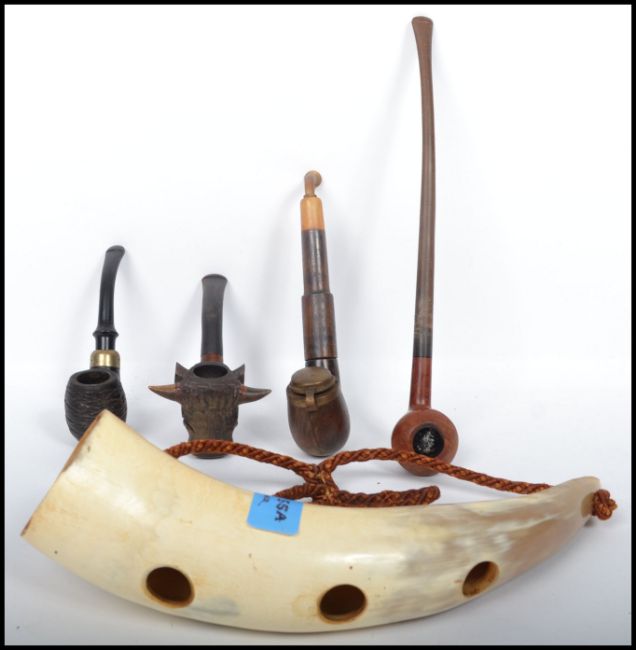 A collection of 4 vintage 20th century smoking pipes together with a hanging ox horn pipe holder. Pipes to include bulls head, long, capped and black forest style. Largest diameter measures 7 cm and longest measures 26 cm.