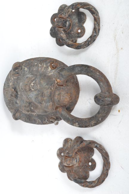 An early 20th century cast iron lion mask door knocker along with a pair of smaller floral door knockers.