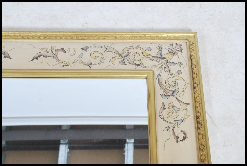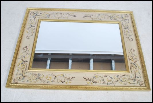 A large 20th century toll ware style mirror with handpainted frame in beige with scrollwork, central mirror within.