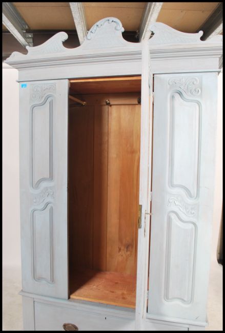 An Edwardian walnut shabby chic painted single wardrobe armoire. The base with shaped legs having plinth drawer with mirror door robe atop. Finished with a flared edge top above and in a grey paint decoration