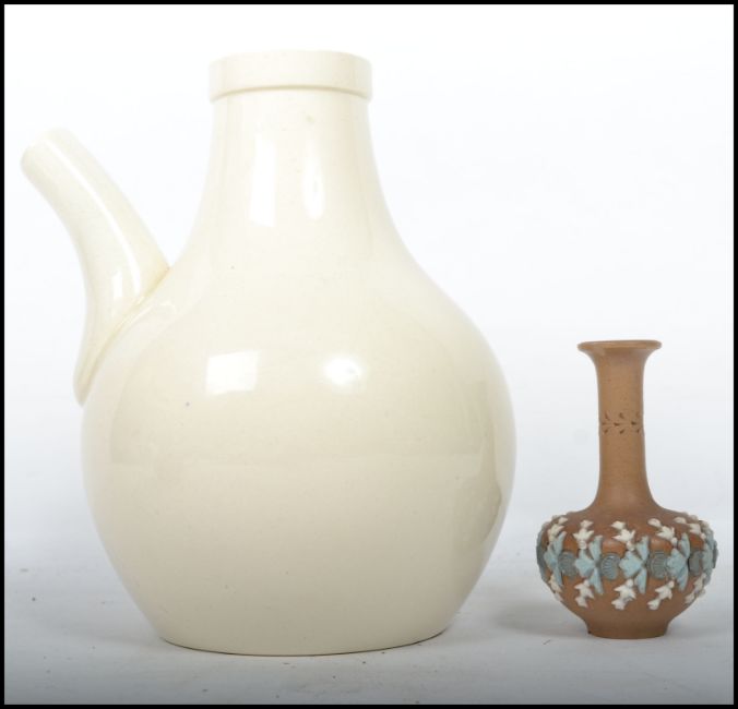 A mid century Walter Moorcroft bed pot with impressed and painted marks to base having a plain design along with an Old Tupton Ware tube lined vase and a Doulton silicon vase 1369. Measurements: 20 cm highest, 16 cm widest and 15 cm deepest.