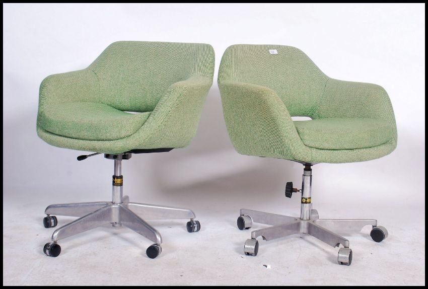 A pair of 1970's office swivel chairs in the manner of Eero Saarinen ' executive chairs ' Each with tub frames being wool upholstered in green having pierced backs. All raised on chrome tubular swivel bases