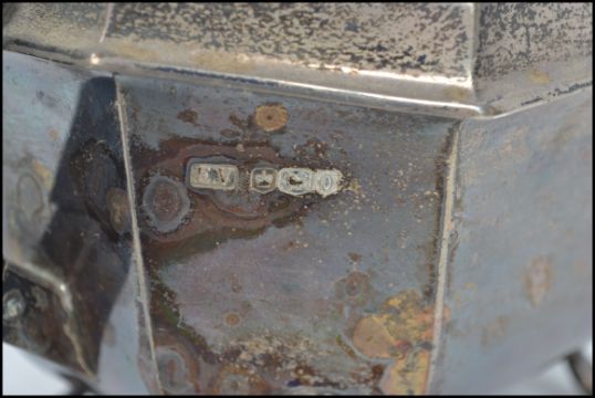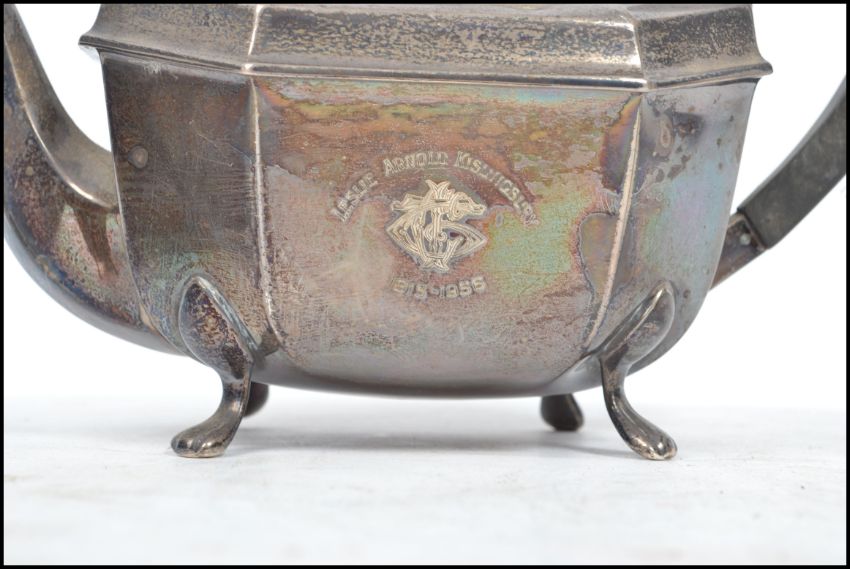 A three piece silver hallmarked tea service by Viners, to include a teapot, creamer and sugar bowl, assay mark for Sheffield, makers marks for Emile Viner and dating to 1956. Inscription to the front for a Leslie Arnold Kingsbury 1915 -1956. The service gifted to him on his retirement from Wills tobacco factory.