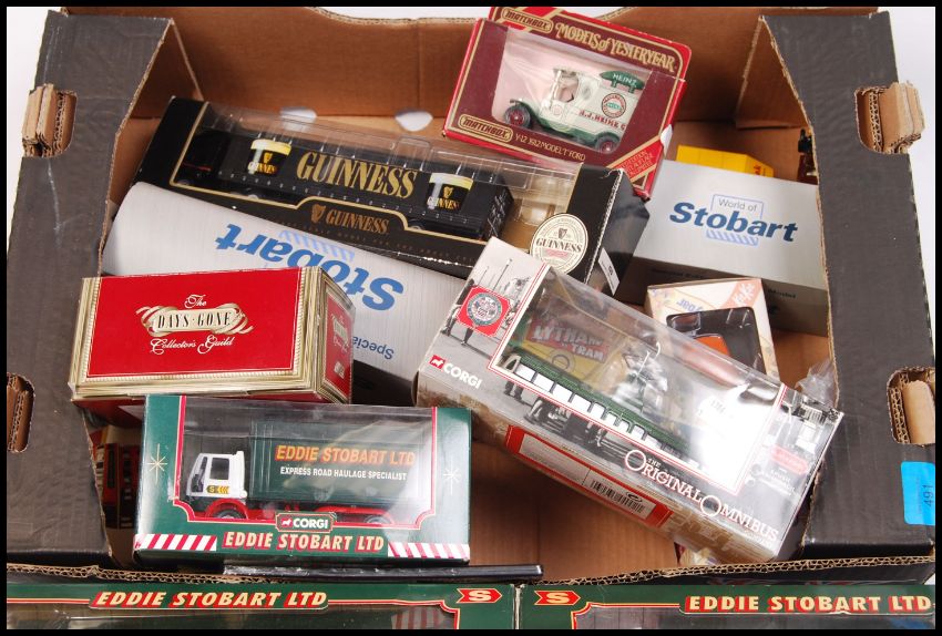 A large collection of assorted Corgi, Matchbox & Lledo diecast model cars to include; Eddie Stobart 59601 Box Van, 59502 Lorry, 59516 Lorry & Trailer, Days Gone Collection, Corgi 59529 Guinness Truck, Model Of Yesteryear etc. All within their original boxes.