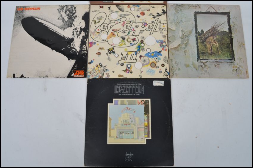 A group of five long play LP vinyl records by Led Zeppelin to include Led Zeppelin K40031,  Led Zeppelin II K40037, Led Zeppelin III K50002, The Song Remains the Same SSK89402 and Led Zeppelin IV K50008.
