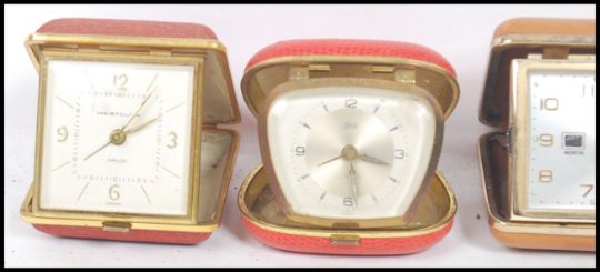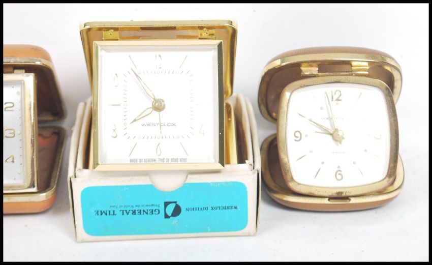 A group of five vintage retro 20th century travel clocks to include a boxed Westclox, another Westclox, Coral with date, day and month aperture.