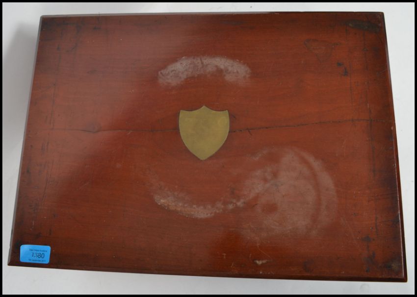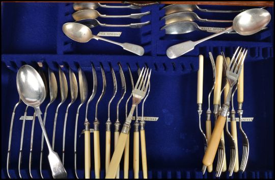 An Edwardian period oak campaign style cutlery canteen with sunken brass handles, lift up top and  three drawers of contents.
