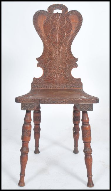 A late 19th / early 20th century  oak hall chair, with a shield shape back, on turned tapering legs Measures 92cms by 42cms by 42cms.