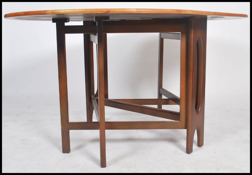 A 1970's teak wood drop leaf dining table having shaped legs in the manner of G-plan, the long leaves raised on gate leg action. Measures 74cms x 107cms x 24cms.