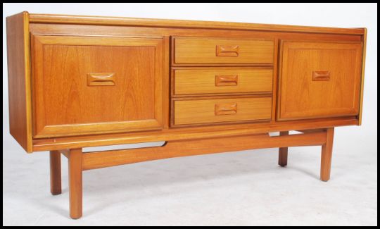 A retro G-plan style teak sideboard having drawers flanked by cupboards either side raised on shaped legs. Measures 76cms x 162cms x 45cms.