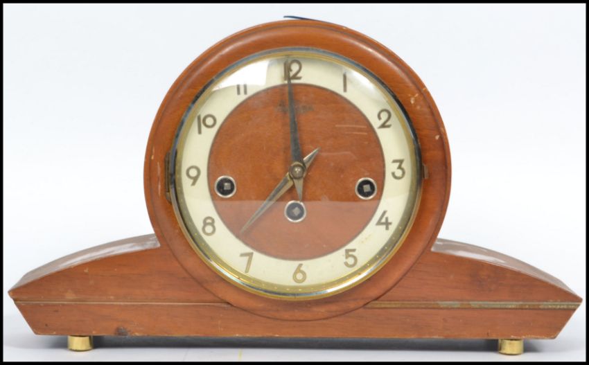 A vintage art deco style wooden cased mantle clock by Bentima having an circular face with sloped shoulders having a German 6 day movement marked 67 340-020. Measurements: 19 cm high and 35 cm wide.
