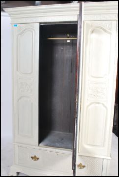 An Edwardian walnut shabby chic painted single wardrobe armoire. The base with shaped legs having plinth drawer with mirror door robe atop. Finished with a flared edge top above and in a cream paint decoration. Measures 76cms by 86cms by 42cms