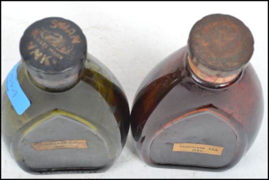 Two retro vintage 20th century Advertising point of sale Swan Ink glass bottles with labels to front in red and black ink.