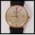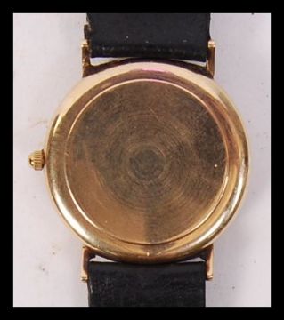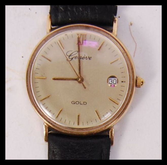 A vintage hallmarked 9ct gold Geneve watch having day aperture, baton numerals and winder to side set to a vintage black leather strap.