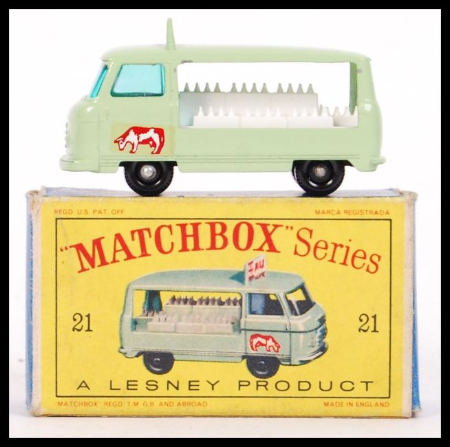 An original vintage Matchbox Lesney pale green Milk Delivery Truck, 21. With original stickers, plastic windows & black undercarriage & tyres. Mint. Within its original box.