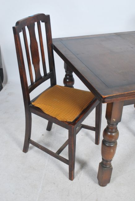 A 20th century oak utility type draw leaf refectory dining table raised on shaped legs together with a pair of matching dining chairs ( see illustrations )
