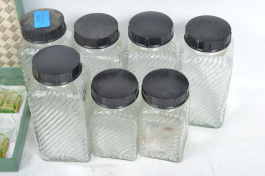A collection of seven vintage 20th century Hygena kitchen storage jars, each with the Hygena logo flashing across the front together with a cased set of kitsch liqueur glasses.