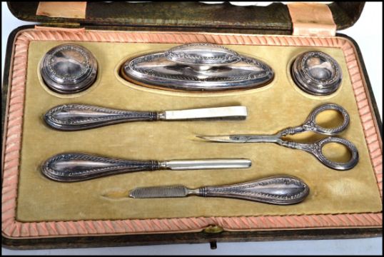 A silver hallmarked ladies vanity set being hallmarked for Birmingham, believed Jones & Crompton, date letter n, 1912 in the original presentation case