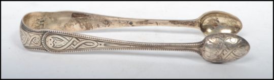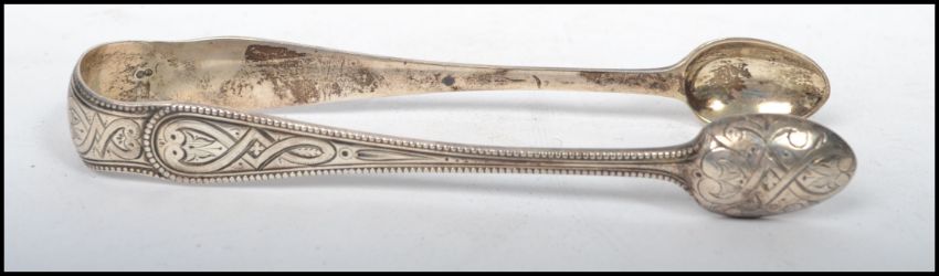 A pair of  silver hallmarked sugar tongs dating to the 19th century Victorian period. London assay, makers mark for Chawner & Co (George William Adams).