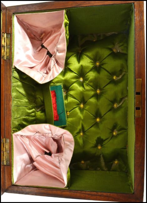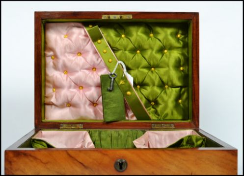 A 19th century Victorian walnut jewellery work box having copper cartouche panel to lid with inset swing handle dual barrel lock. The hinged lid opening to reveal a pink and green velour button back interior with pockets to the corners. Complete with key. Measures 15cms high by 28cms wide and 20cms deep.