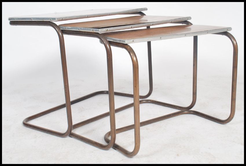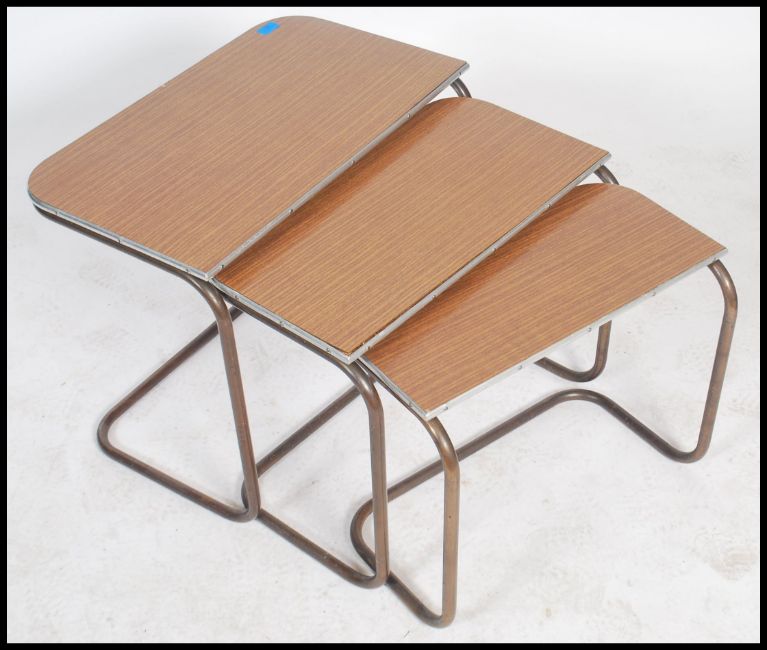 A trio nest of counter lever tables of tubular metal construction being Formica topped in the manner of ' Tavo '. Measures 50cms x 62cms x 39cms.