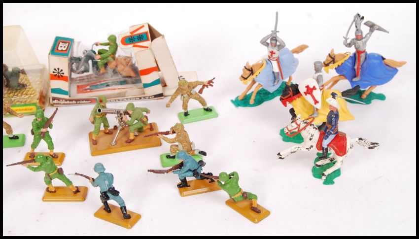 A collection of Britains boxed diecast vehicles to include; 9682 Dispatch Rider, 9681 German Army Combination & 9705 25 Pounder Gun Howitzer. Also to include loose Britains Deetail diecast soldiers such as; 75mm Gun, green & blue combat soldiers etc.