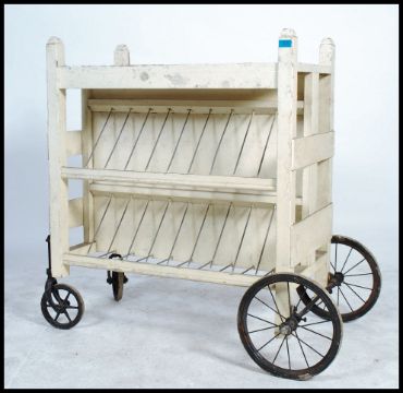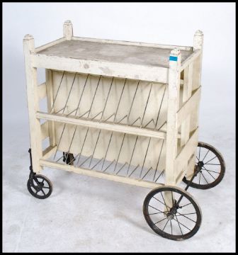 A 20th Century scratch built school canteen trolley in white paint, vintage wheels and wire racking. Measurements 1029cms x 85cms x 47cms.