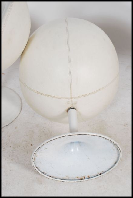 A set of three good Arkana style enamel painted metal tulip chairs being egg shaped and upholstered in a white leather fabric