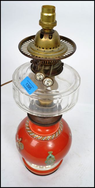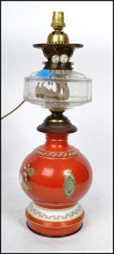 A neoclassical oil lamp being converted to electric the reservoir having a red ground and Greek key pattern to base, notation for William Whitney.