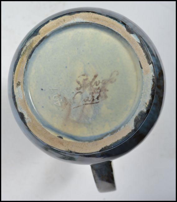 A collection of vintage 20th century SlyvaC and other studio pottery to include a pair of flared vases with ribbed bodies raised on a circular foot, a large bulbous jug with a shaped handle and flared rim, a ribbed tapering vase and a pair of vases of unusual form stamped 29 to base. Measurements: 24 cm highest, 22 cm widest and 21 cm deepest.