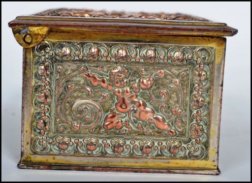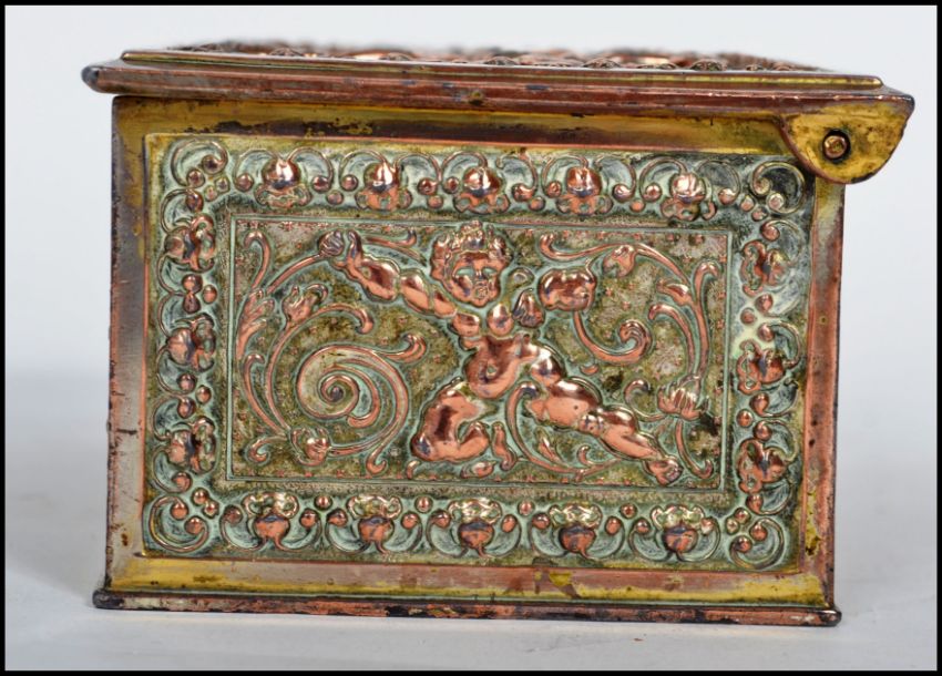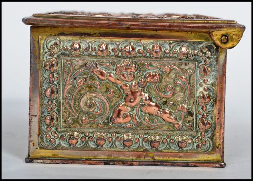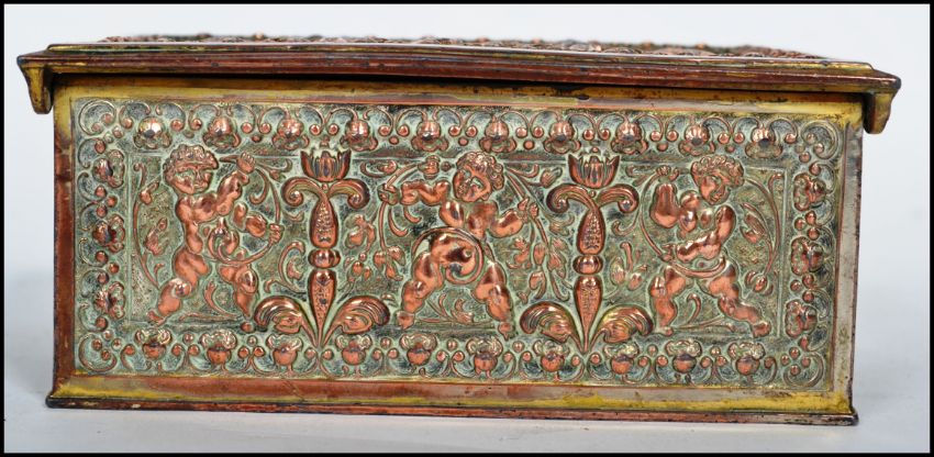 A 19th century silver plate on copper lidded jewellery casket each panel / side decorated with putti's in repose.