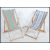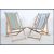 A pair of mid century deck chairs with wooden frames and a striped material hammock.