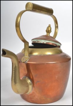 A group of early 20th century copper kettles to include a William Soutter & Sons example along with a wooden handled copper simplex No4 posser. Measurements: 65 cm highest, 40 cm widest and 20 cm deepest.