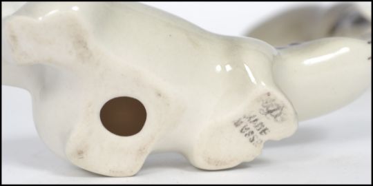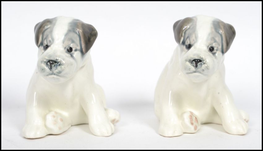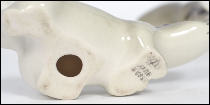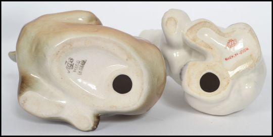 A group of six mid century made in USSR ceramic figurines to include a pair of terrier dogs a polar bear, a brown bear cub and a pair of badgers. Dogs measure 11cms high. Condition Report: No visible damage to any of the figures all appear in good order.