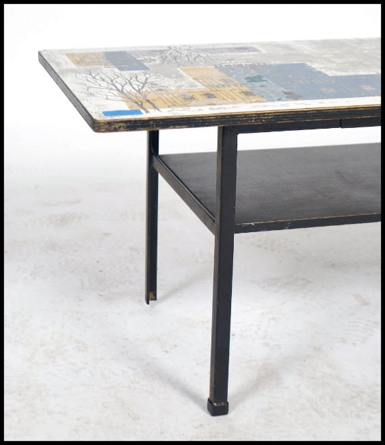 A Terence Conran coffee table depicting London scenes being raised on ebonized metal legs designed in 1958. Measures 12cms x 48cms x 58cms.