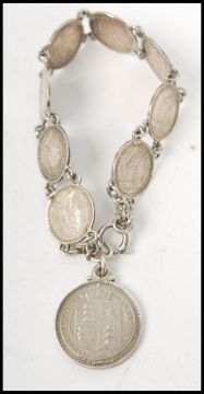 A 19th century Victorian silver bracelet, constructed from eight Victorian silver three pence coins each united by silver links  finished with an 1887 Victorian shilling.