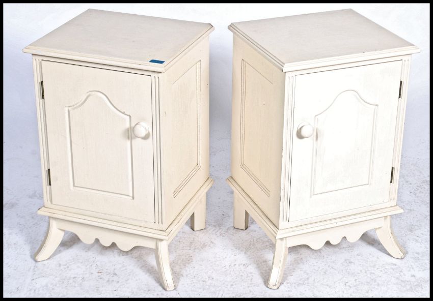 A pair of painted off white / cream bedside cabinets having open recess above swing door with turned knob handles, raised on splayed legs. Measures 68cms x 41cms x 37cms