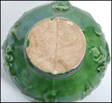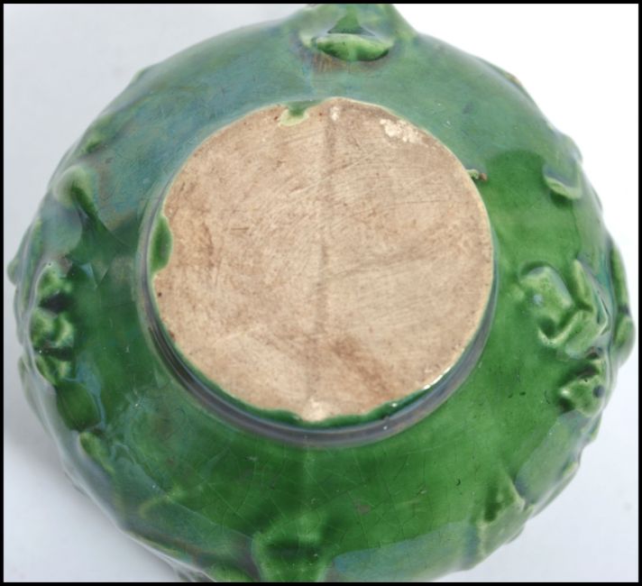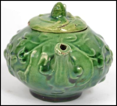 A 19th century Oriental ceramic Yi Xing tea pot of globular form having a green textured naturalistic decoration. Measurements: 6 cm high, 10 cm wide and 7 cm deep.
