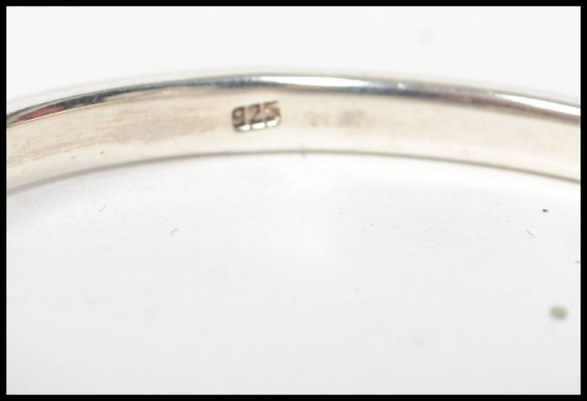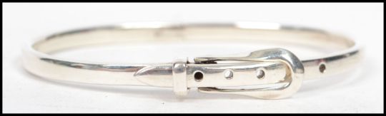 A sterling silver bangle bracelet in the form of a belt and buckle marked 925, weighs 15.4 grams.