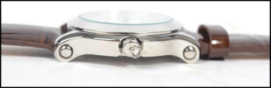 A contemporary wristwatch by Gem Nova having a square case adorned with mother of pearl face and diamond batons being set to a leather strap