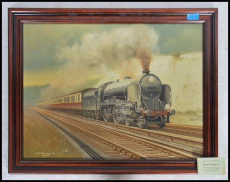 A 20th century oil on canvas painting of a \steam train in motion  ( see illustrations ) by Eric Bottomley 1984. Set within mahogany frame