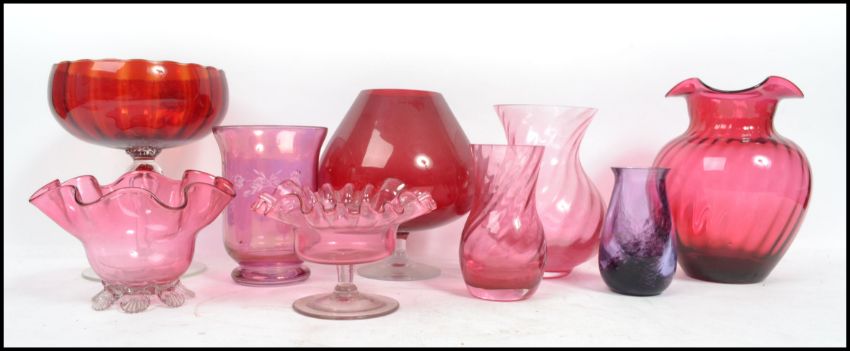 A collection of early 20th century cranberry glass wares to include centrepiece vases, oversized brandy glass, handkerchief vase etc