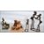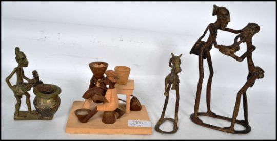 A group of three African brass sculptures to include a warrior on a rearing horse, a drinks pourer, and a dentist along with a wooden carving figurine of a of a Nigerian man grinding maize. Measures 21cm high.