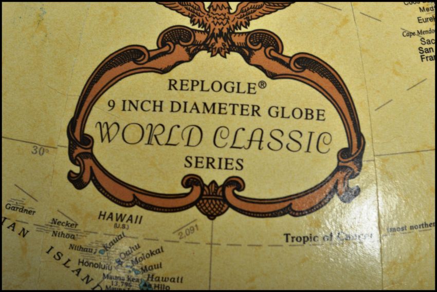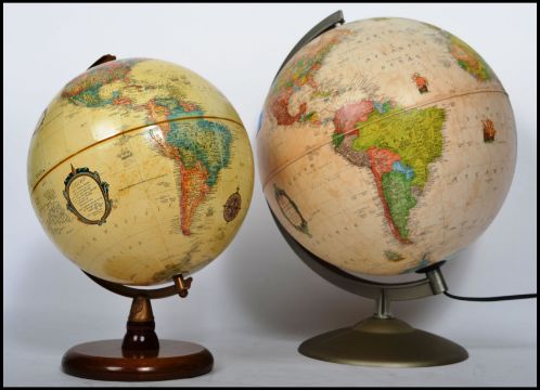 Two vintage 20th century desktop globes one being an antique style Heritage example and the other being a smaller American Replouse globe, both raised on circular bases.