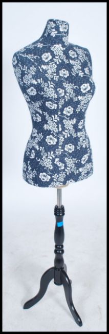 A vintage 20th century dressmakers dummy raised on an adjustable ebonised tripod base with a floral upholstery. Measures 146cms high by 36cms wide by 20cms diameter.