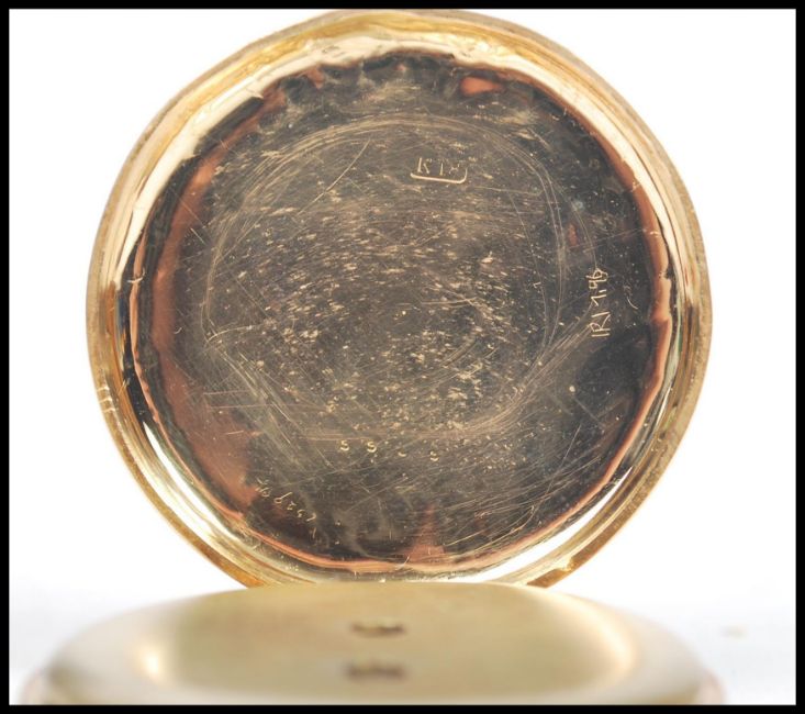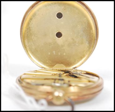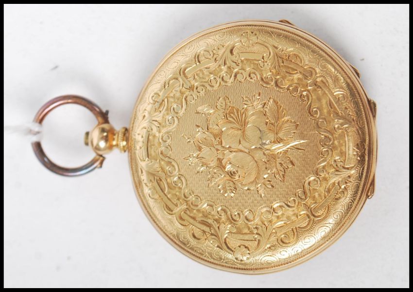 An 18ct gold early 20th century open faced fob / pocket watch with engine turned dial having faceted hands  with roman numerals. Rococo chase case with the inside cover marked 18k. Total weight 39g. With key