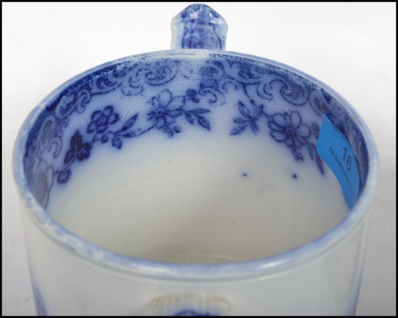 A pair of 19th century Staffordshire blue and white twin handled loving cups, each with country scenes being marked to the bases. Measurements: 11 cm high, 19 cm wide and 12 cm deep.