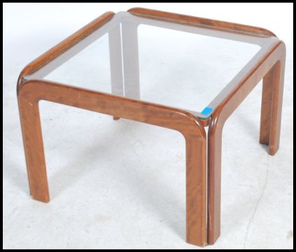 A 1960s G-plan style coffee table having four teak panel curved section creating wide legs with inset glass to top.