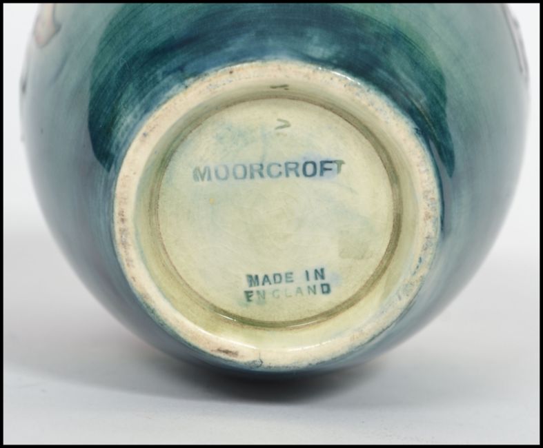 A c1950s Walter Moorcroft globular vase having tube lined and painted floral decoration on a blue and white ground. Blue upper case Moorcroft and Made In England to base. Measures 13.5cms high. Condition Report: In good order with no signs of cracks or repair but does have crazing to the white and blue ground.