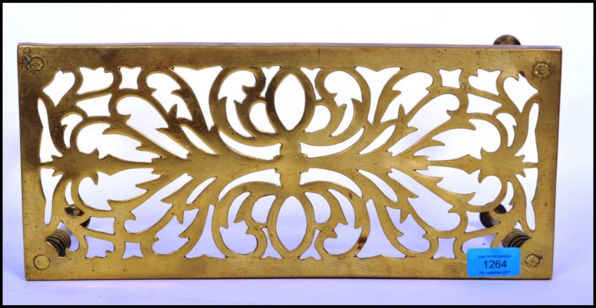 A 19th century brass fireside trivet of rectangular form having a fret pierces design atop raised on four bobbin legs.